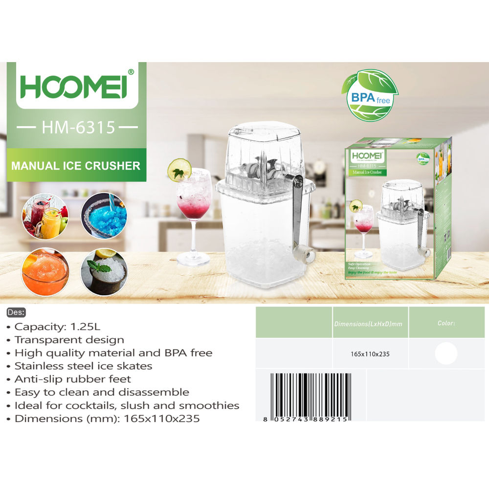 Il Tritaghiaccio Manuale Hoomei è un dispositivo pratico e versatile, ideale per preparare granite, cocktail e dessert ghiacciati direttamente a casa. Grazie al suo funzionamento manuale, non necessita di alimentazione elettrica, rendendolo utilizzabile in qualsiasi momento. Facile da utilizzare e pulire: il suo design semplice consente un utilizzo intuitivo e una pulizia agevole dopo l'uso.